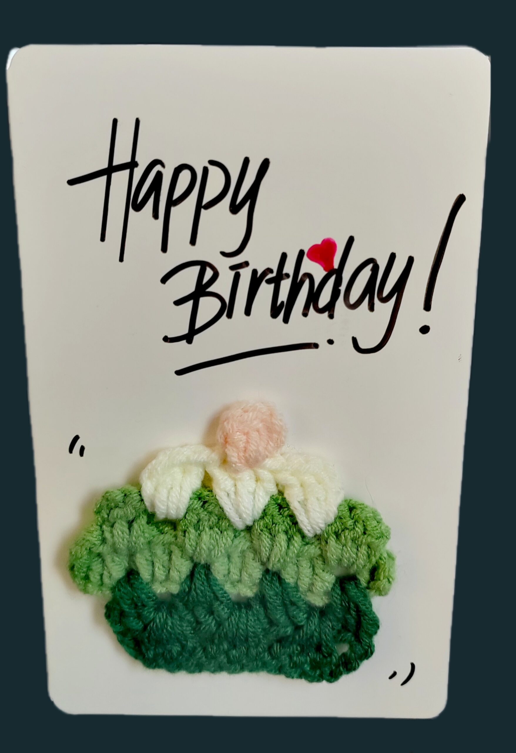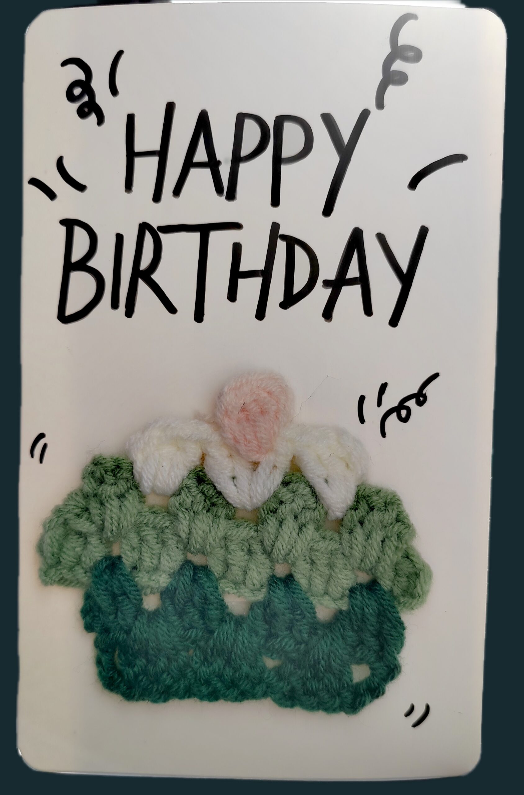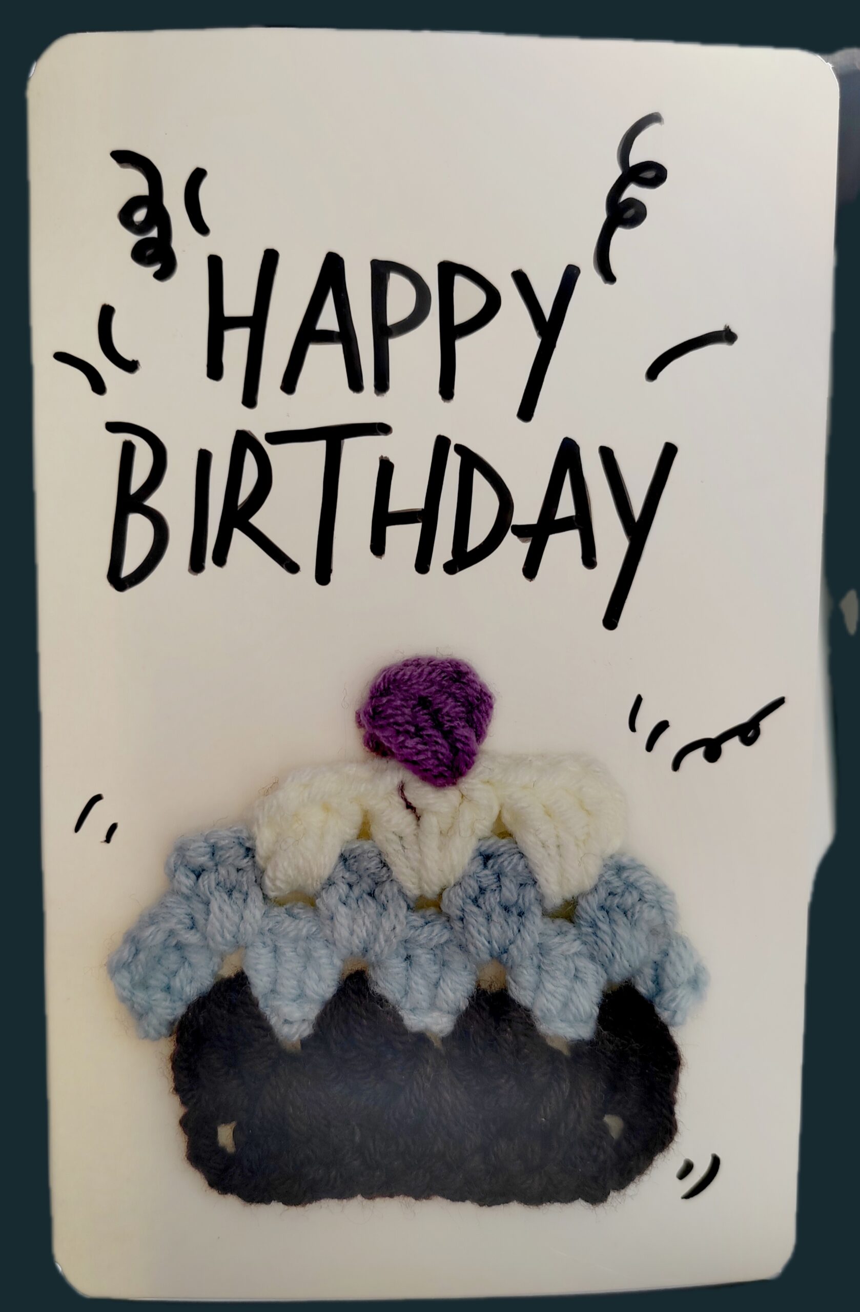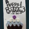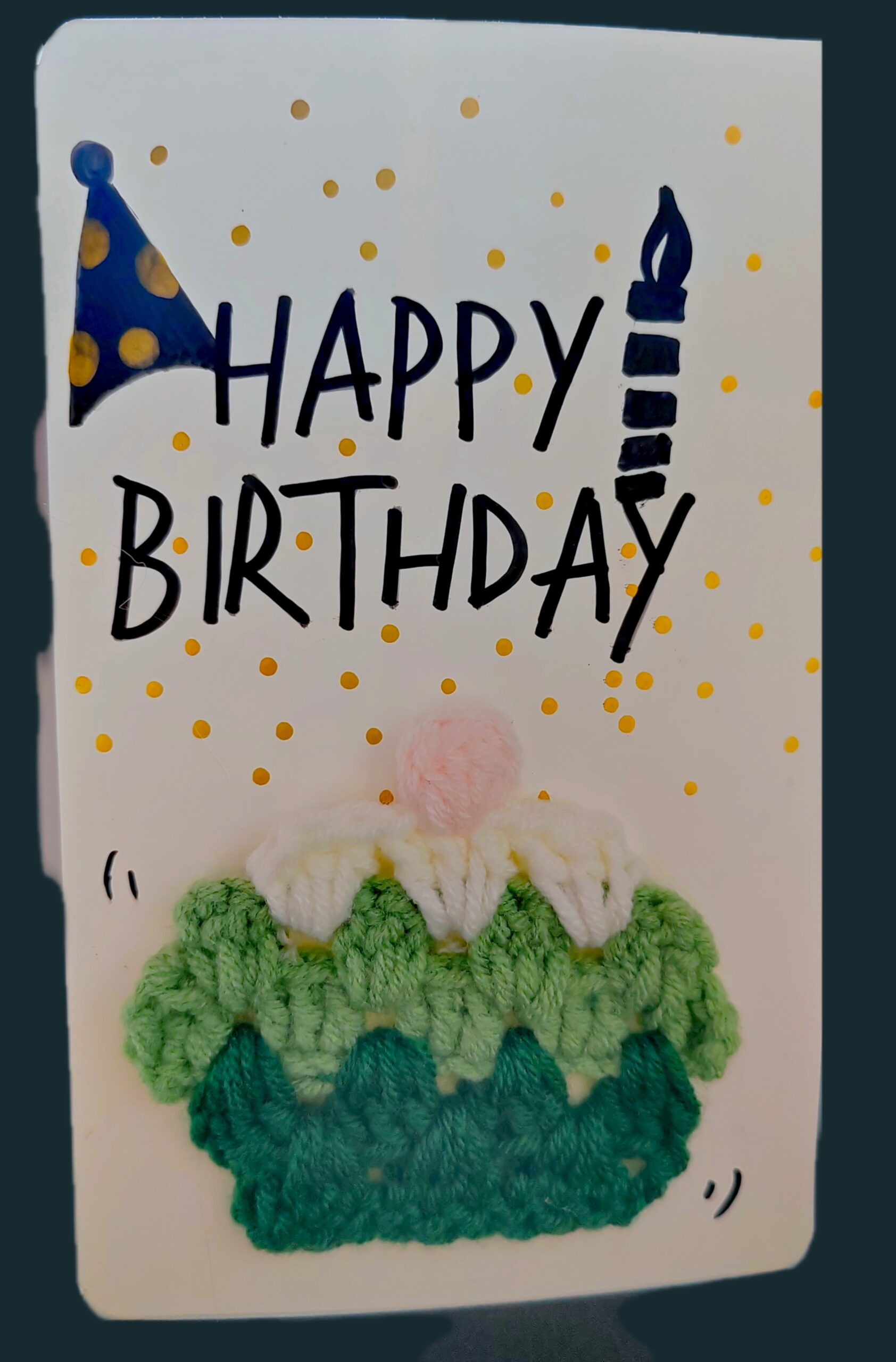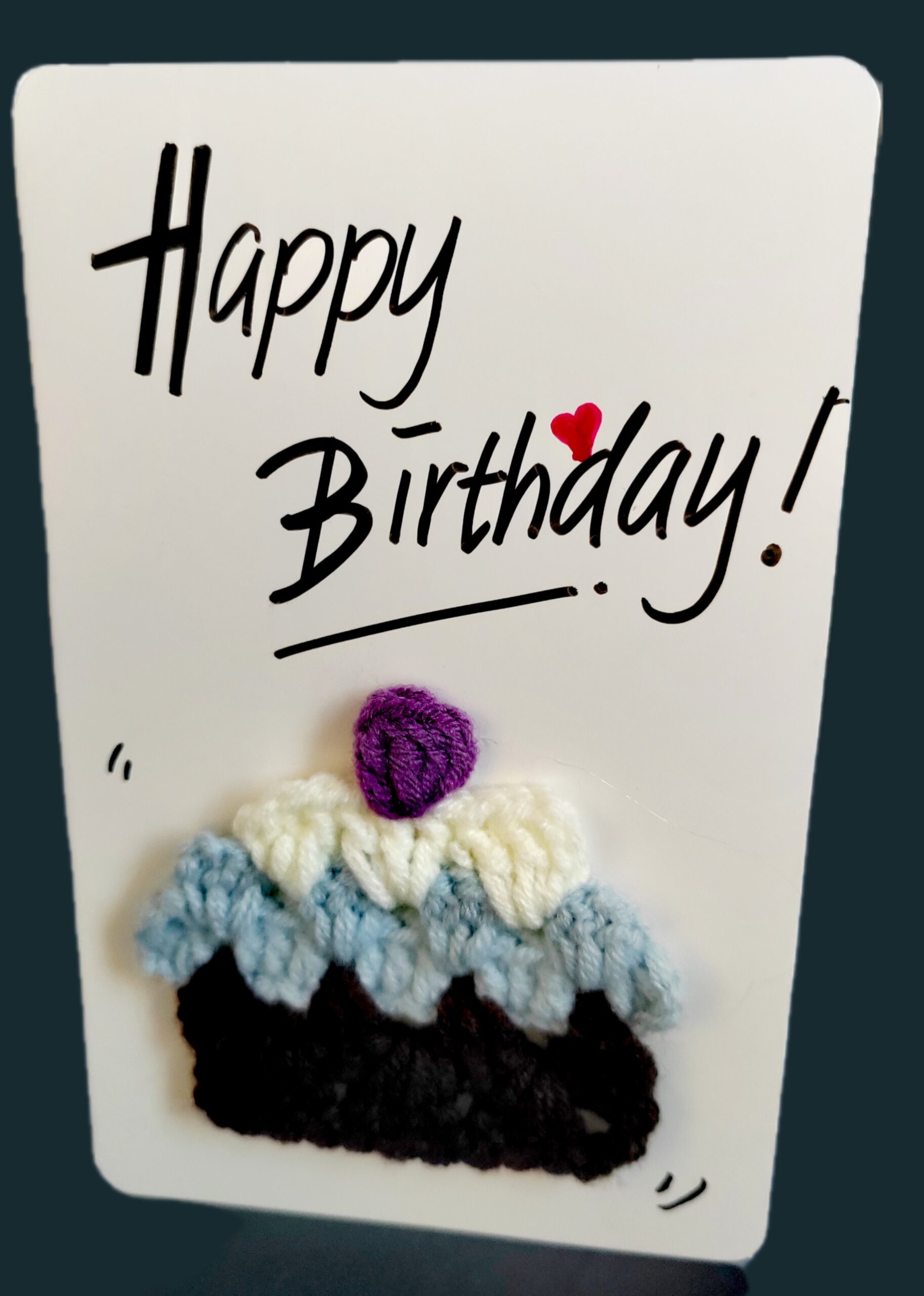 -The card features a colorful crochet cake with soft yarn.